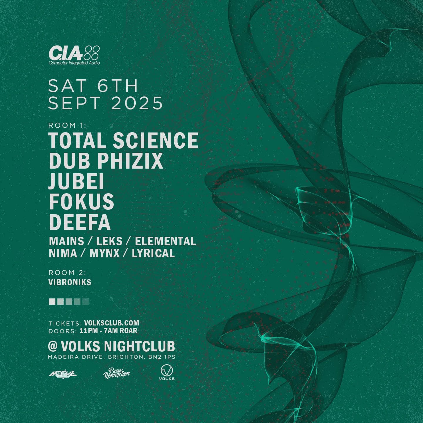 CIA Brighton Sept 2025 Square instagram A flyer advertising a drum and bass event at Volks Nightclub, with performers like Total Science, Dub Phizix, and Jugel, showcasing electronic music artwork and event information.